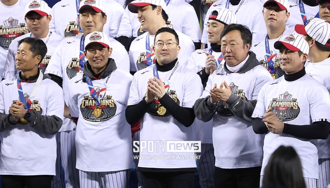 ▲ 염경엽 감독 구광모 회장 오지환 ⓒ곽혜미 기자구광모 회장 역시 벅차기는 마찬가지. 2018년부터 선대 회장의 뒤를 이어 구단주를 맡은 구광모 회장은 우승 확정 직후 "너무나 감격스럽다. 세계 최고의 무적 LG 팬 여러분, LG 트윈스가 29년 만에 드디어 우승했다. 29년이라는 오랜 기다림 속에서도 변함없이 LG를 사랑하고 응원해 주신 팬 여러분께 진심으로 감사드린다"고 이야기했다.