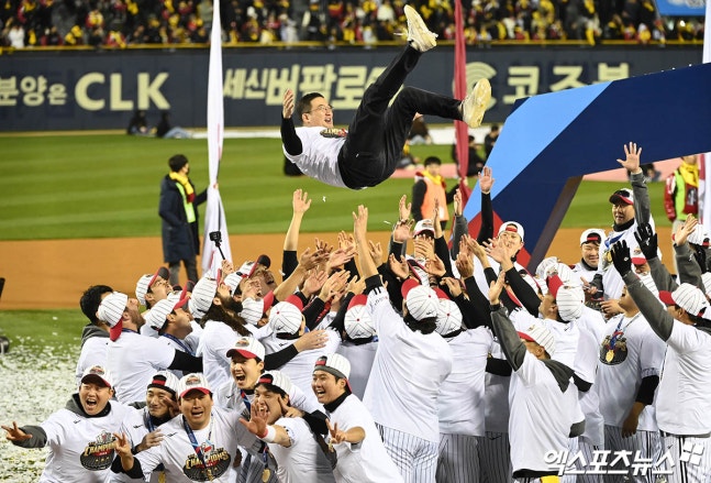 구광모 LG그룹 회장이 야구단의 한국시리즈 우승 현장을 지켜보며 기쁨을 만끽했다. 선수들의 헹가래까지 받으며 29년 만의 정상 등극 기쁨을 톡톡히 누렸다.