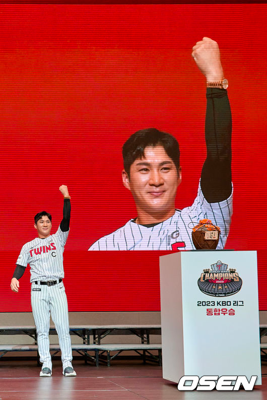 LG 트윈스는 17일 서울 마곡 LG 사이언스파크 컨버전스 홀에서 ‘LG트윈스 2023 한국시리즈 통합우승 기념행사’ 를 개최했다. 행사 자리에는 LG 트윈스 구광모 구단주와 LG그룹 관계자, LG 트윈스 선수단 및 프런트 등 160여 명이 참석했다.