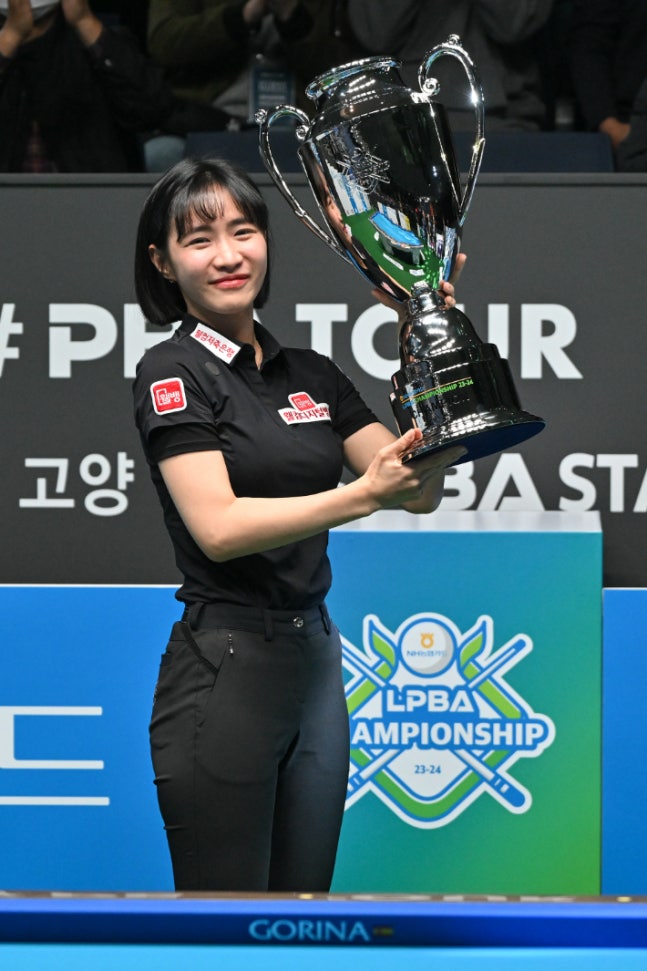 최혜미가 8일 경기도 고양시 '고양 킨텍스 PBA 스타디움'에서 열린 'NH농협카드 PBA 챔피언십' 여자부 정상에 오른 뒤 우승컵을 들고 포즈를 취하고 있다. PBA프로당구(PBA) 여자부에서 새로운 스타가 탄생했다. 동호인 출신으로 길지 않은 구력에도 빠르게 기량을 끌어올린 재능에 빼어난 미모까지 갖춘 최혜미(29·웰컴저축은행)다.
