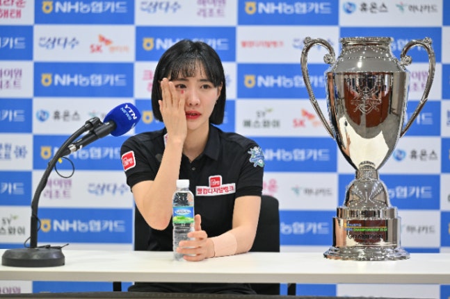 최혜미가 8일 경기도 고양시 '고양 킨텍스 PBA 스타디움'에서 열린 'NH농협카드 PBA 챔피언십' 여자부 정상에 오른 뒤 인터뷰에서 눈물의 소감을 밝히고 있다. PBA특히 부모님이 보는 앞에서 일궈낸 우승이라 더 값졌다. 최혜미는 "4강전과 결승에서 부모님, 특히 아버지가 많이 우셨다"는 말에 "아빠를 보면 항상 눈물이 난다"고 말했다.