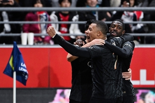 파리 생제르맹의 킬리안 음바페가 랭스와 원정에서 팀의 두 번째 골을 넣은 뒤 동료들과 기뻐하고 있다. AFP 연합뉴스선발 출전한 이강인은 후반 32분 셰르 은두르와 교체될 때까지 그라운드를 누볐으나 공격포인트를 올리지는 못했다.
