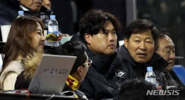 류현진(오른쪽)과 아내 배지현(왼쪽) 아나운서. 올 시즌을 끝으로 토론토 블루제이스와 4년 동행을 마친 프리에이전트(FA) 류현진(36)이 한국시리즈 5차전이 열린 잠실구장을 찾았다. 또 다른 코리안 메이저리거 김하성(28·샌디에이고 파드리스)과 내년 시즌 메이저리그 진출이 유력한 이정후(25)도 한국시리즈 현장을 찾아 LG 트윈스의 3번째 통합 우승을 지켜봤다.류현진은 13일 김하성, 이정후와 함께 한국시리즈(7전 4선승제) 5차전이 열린 잠실구장을 방문했다. 류현진은 이날 합동 시구를 펼친 김응룡, 김성근, 김인식 전 감독과 인사를 한 뒤 잠시 이야기를 나누기도 했다. 김하성과 함께 시구 행사에 참여하기도 했다.