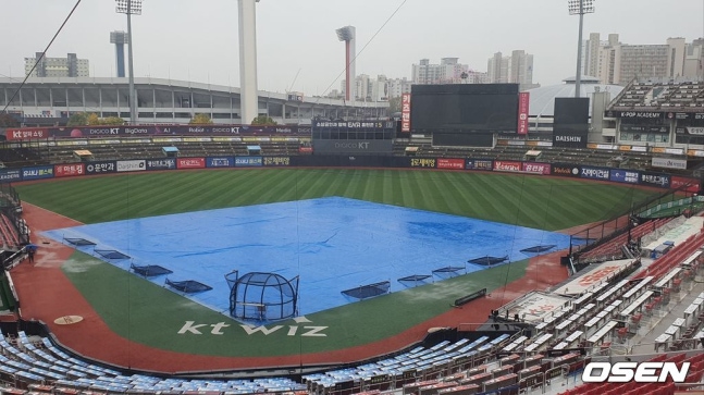 [OSEN=잠실, 한용섭 기자] 5일 플레이오프 5차전을 앞두고 방수포가 덮힌 수원 KT위즈파크 /orange@osen.co.kr